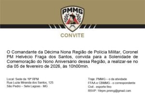 A 19ª Região da Polícia Militar de Minas Gerais (19ª RPM), com sede na Rua Luzia Miranda dos Santos, no bairro São Pedro, em Sete Lagoas, celebra nesta quinta-feira (05/02), às 10h, seu nono aniversário com uma solenidade especial marcada por homenagens e pela inauguração oficial do Centro Integrado de Comando e Controle (CICC) do Guardião 7L, sistema que reúne o monitoramento e a coordenação de ações de segurança pública por meio de câmeras de videomonitoramento.
