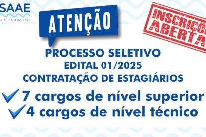 O Serviço Autônomo de Água e Esgoto (SAAE) de Sete Lagoas abriu nesta segunda-feira, 19 de janeiro, as inscrições do Processo de Seleção de Estagiários, nas...
