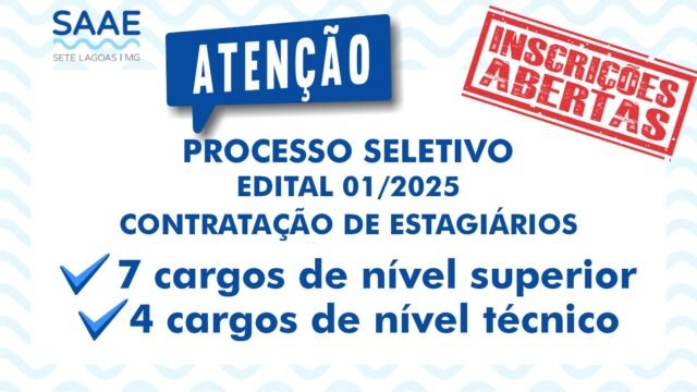 O Serviço Autônomo de Água e Esgoto (SAAE) de Sete Lagoas abriu nesta segunda-feira, 19 de janeiro, as inscrições do Processo de Seleção de Estagiários, nas modalidades...