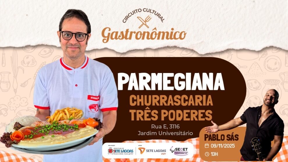 A organização da 3ª Edição do Circuito Cultural Gastronômico de Sete Lagoas (CCG/SL) comunica uma alteração no evento que encerra a programação do domingo, 9 de novembro. O evento previsto para o Bar do Didi (Pão com Bola), que ocorreria às 14h, foi cancelado por motivos pessoais do estabelecimento. Em seu lugar, o Circuito terá uma grande finalização na mesma data, domingo, dia 9 de novembro, na Churrascaria Três Poderes. O novo evento de encerramento começa mais cedo, às 13h.