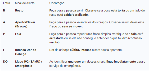 A identificação imediata dos sintomas do AVC por qualquer pessoa é vital para salvar a vida e o cérebro da vítima. Use o acrônimo RÁPIDO para memorizar os sinais mais comuns: