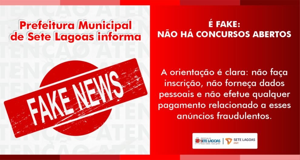 A Prefeitura de Sete Lagoas esclarece que é falsa a informação que circula em sites sobre a realização de concurso público no município, incluindo supostas provas marcadas. Reforçamos que não há qualquer concurso público em andamento.