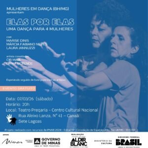 Um espetáculo de dança e improvisação que a cada cidade é modificado a partir da história de de vida de uma ou mais mulheres da região. Essa é a proposta do “Elas por Elas”, criado pelo Ajuntamento Mulheres em Dança, de Belo Horizonte. Nesta edição, as dançarinas improvisadoras Márcia Fabiano Neves e Marise Dinis e a artista da música Laura Jannuzzi iniciam a turnê de apresentações por Minas Gerais, na cidade de Sete Lagoas, no dia 7 de março, sábado, a partir das 20h, com sessão gratuita, seguida de bate-papo, na sede da Companhia Preqaria. A apresentação contará também com tradução em Libras.