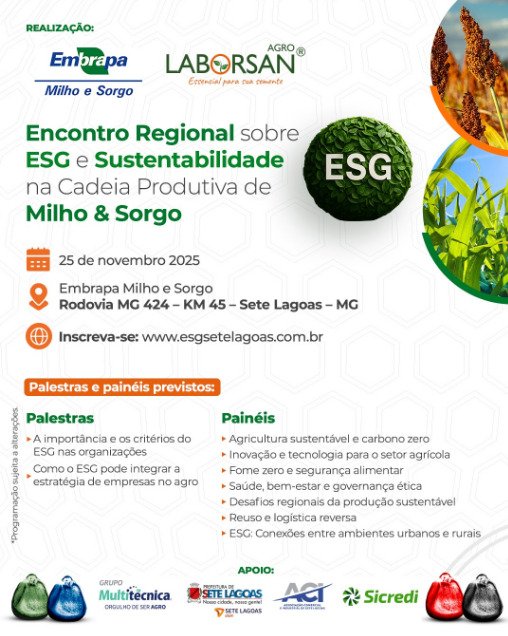 A Embrapa Milho e Sorgo, em parceria com a Laborsan Agro, realiza o primeiro Encontro Regional sobre ESG e Sustentabilidade na Cadeia Produtiva de Milho & Sorgo, no próximo dia 25 de novembro, com vagas limitadas. O evento reunirá especialistas, pesquisadores, empresas e lideranças do setor agropecuário e da indústria para debater os desafios e as oportunidades da sustentabilidade, trazendo uma visão atualizada sobre o papel do ESG na transformação das organizações e no fortalecimento da cadeia produtiva.