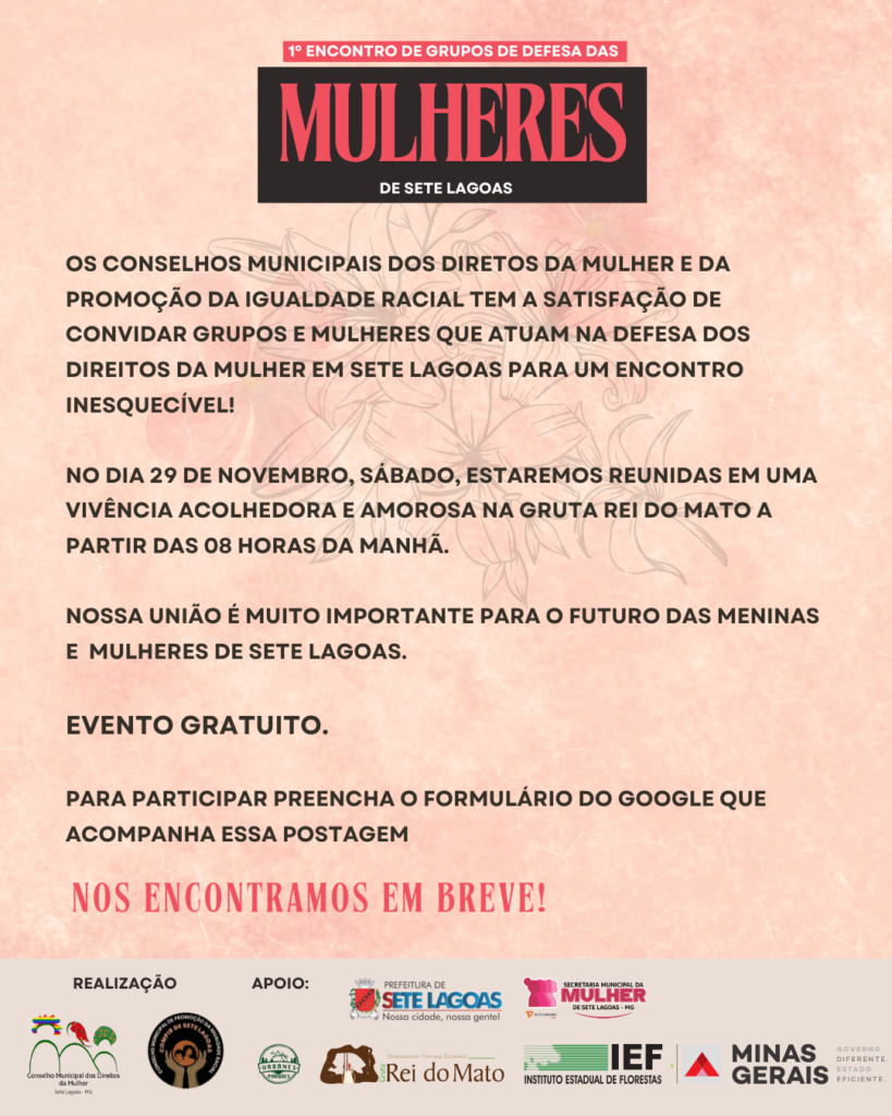 Os Conselhos Municipais dos Direitos da Mulher (CMDM) e de Promoção da Igualdade Racial (COMPIR) de Sete Lagoas têm a satisfação de convidar grupos, coletivos e mulheres que atuam na defesa dos direitos das mulheres no município para um encontro inédito de integração, fortalecimento e troca de experiências.