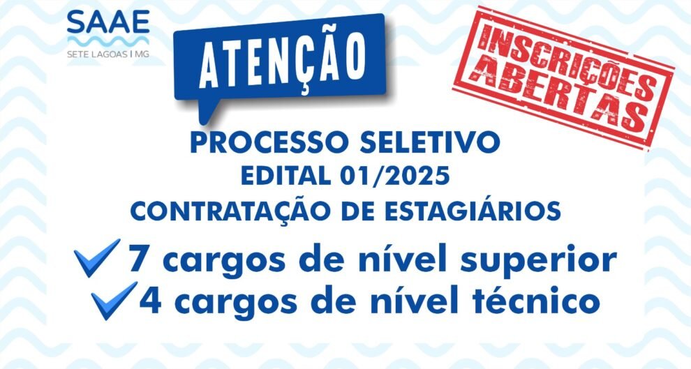 O Serviço Autônomo de Água e Esgoto (SAAE) de Sete Lagoas abriu nesta segunda-feira, 19 de janeiro, as inscrições do Processo de Seleção de Estagiários, nas modalidades obrigatório não obrigatório, para o cadastro de reserva em vários cargos. A iniciativa é regulamentada pelo Edital 001/2025 e podem se inscrever gratuitamente apenas estudantes de instituições educacionais que tenham firmado convênio com a autarquia.